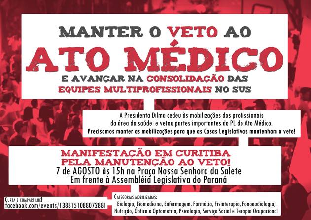 Na próxima sexta (28) às 17h, profissionais de saúde de todo o país vão às ruas reivindicar o veto presidencial sobre o Projeto de Lei que dispõe sobre o exercício da Medicina (Ato Médico). Em Curitiba, o manifesto será na Boca Maldita.
